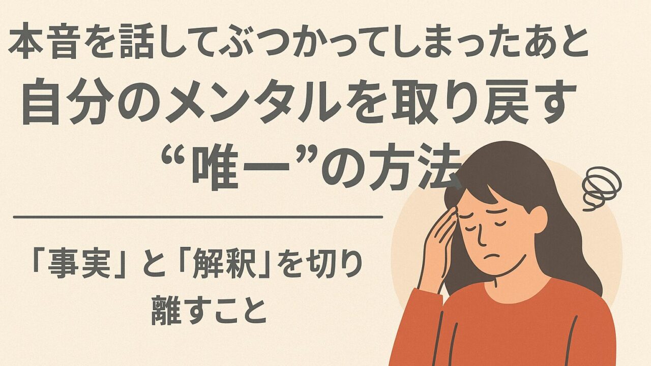 勇気を出して本音を伝えた。けれど相手とぶつかってしまった――そんなとき、胸のざわつきや不安が消えずに苦しい人は多いです。この記事では、「事実」と「解釈」を切り離すというシンプルで効果的な方法を、今日から使えるステップで紹介します。