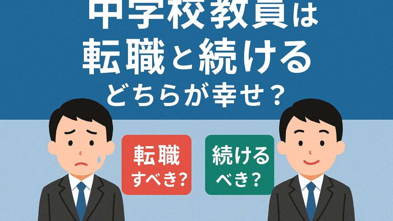 中学校の教員として働いていると、「このまま続けるべきなのか」「転職した方が幸せなのか」と悩む瞬間は少なくありません。どちらが正解というわけではなく、何を大切にしたいかによって“幸せの形”は変わります。本記事では、教員を続ける場合と転職する場合の両方の幸せについて、現場経験を踏まえて整理します。